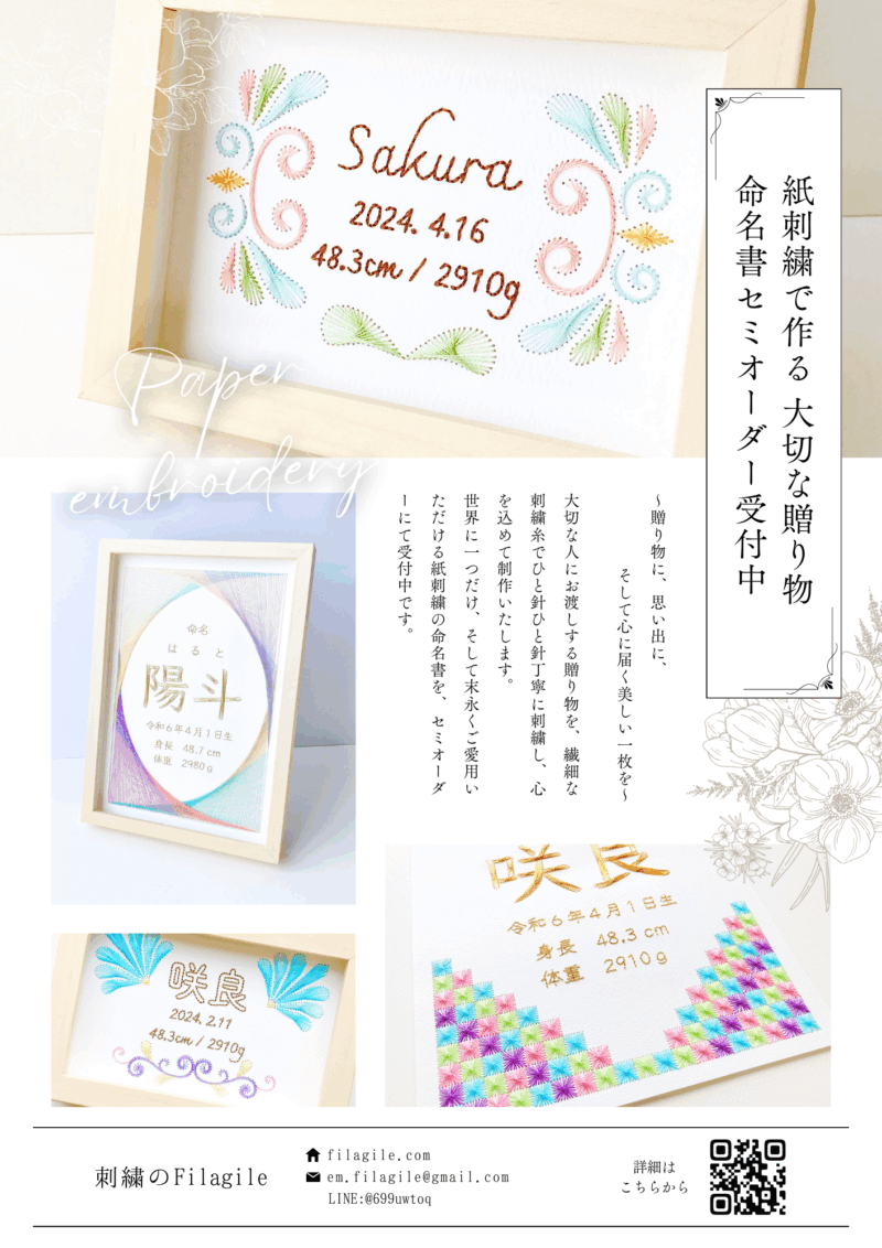 紙刺繍で、命名書をセミオーダーでお作りいたします。