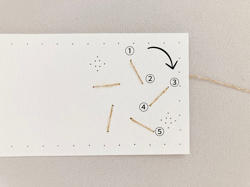 まず①に、裏から針を刺し、番号通りに刺していきます。星は、時計回りに線をなぞるように刺していきます。