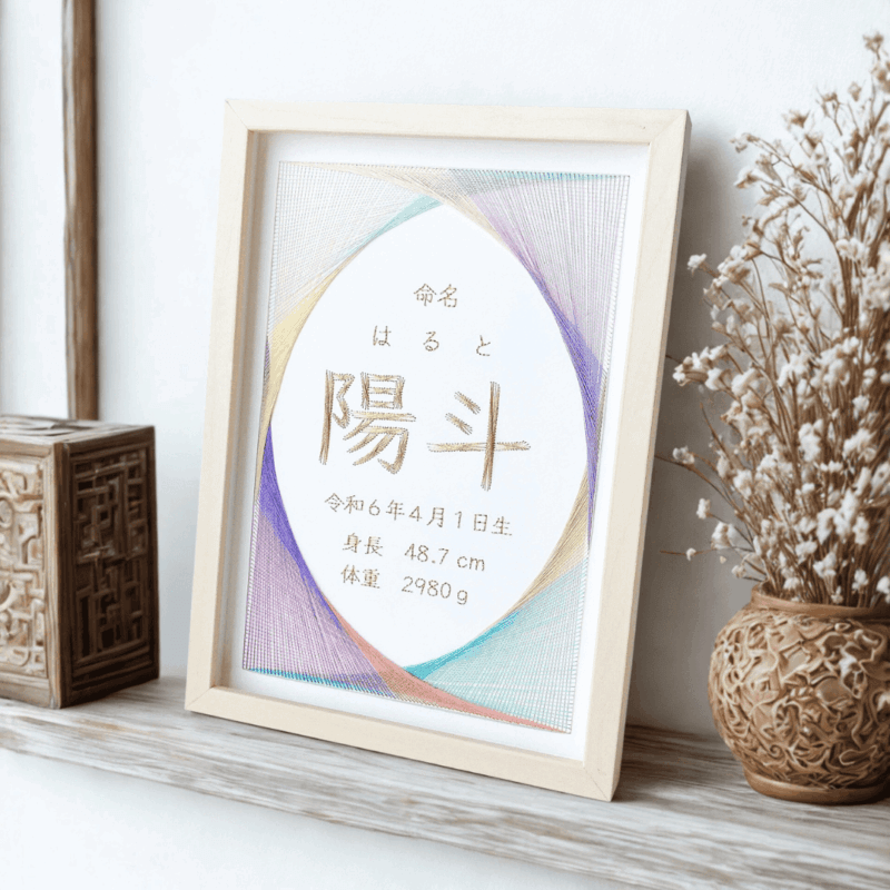 ストリングアートとは、点と点を糸で繋いで、模様や文字を生み出す技術です。特に漢字をストリングアートで刺すことは非常にテクニックがいる技法です。漢字の図案は、お一人お一人の名前に合わせて、制作いたします。