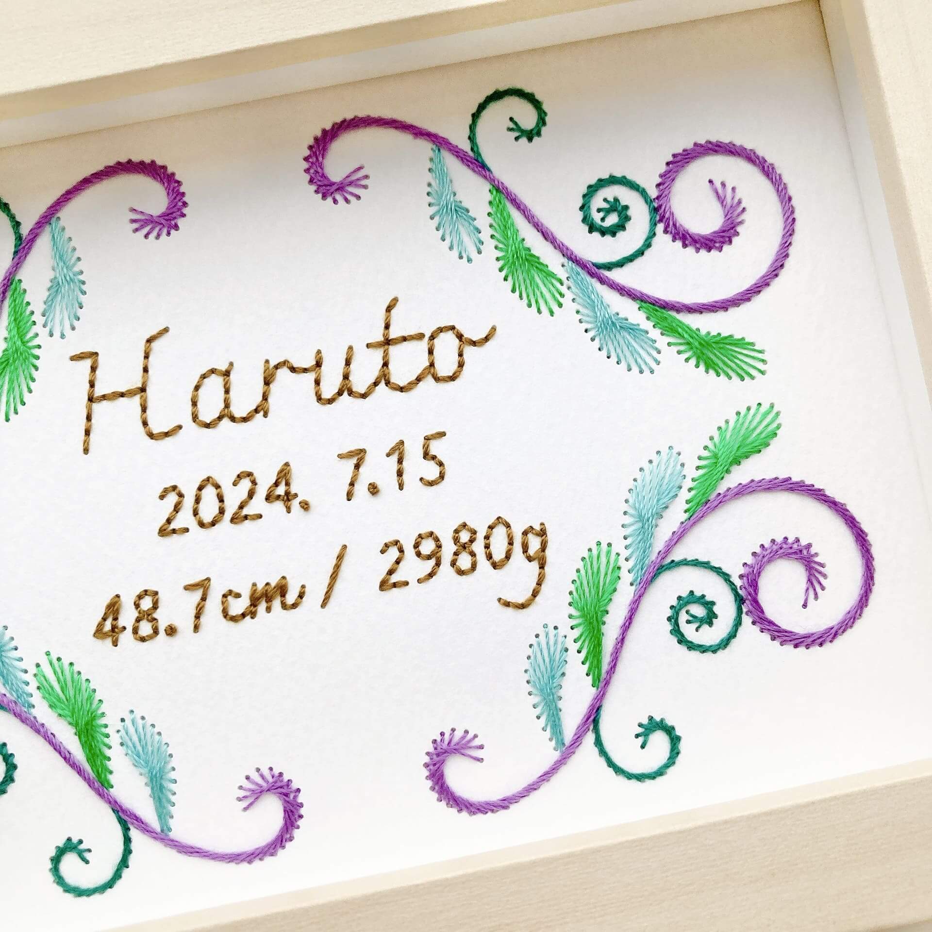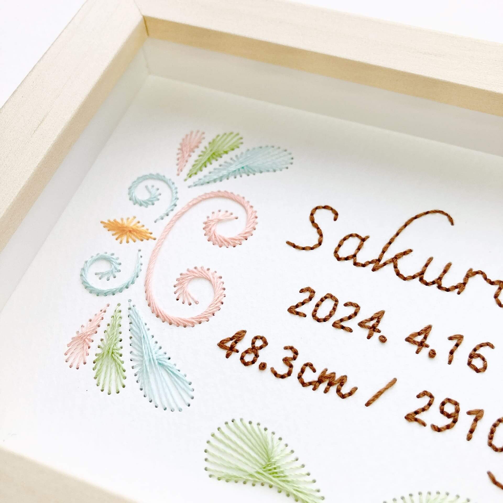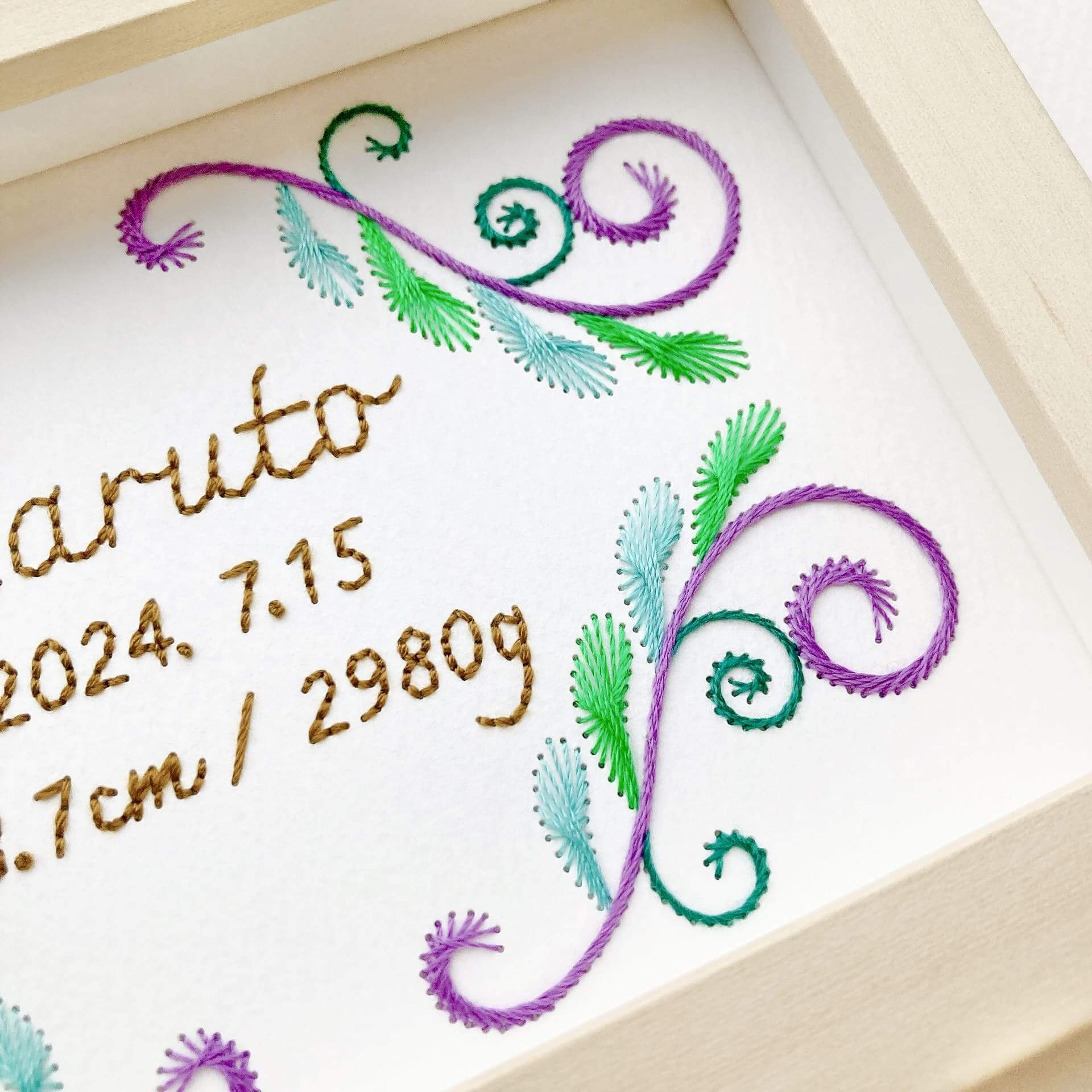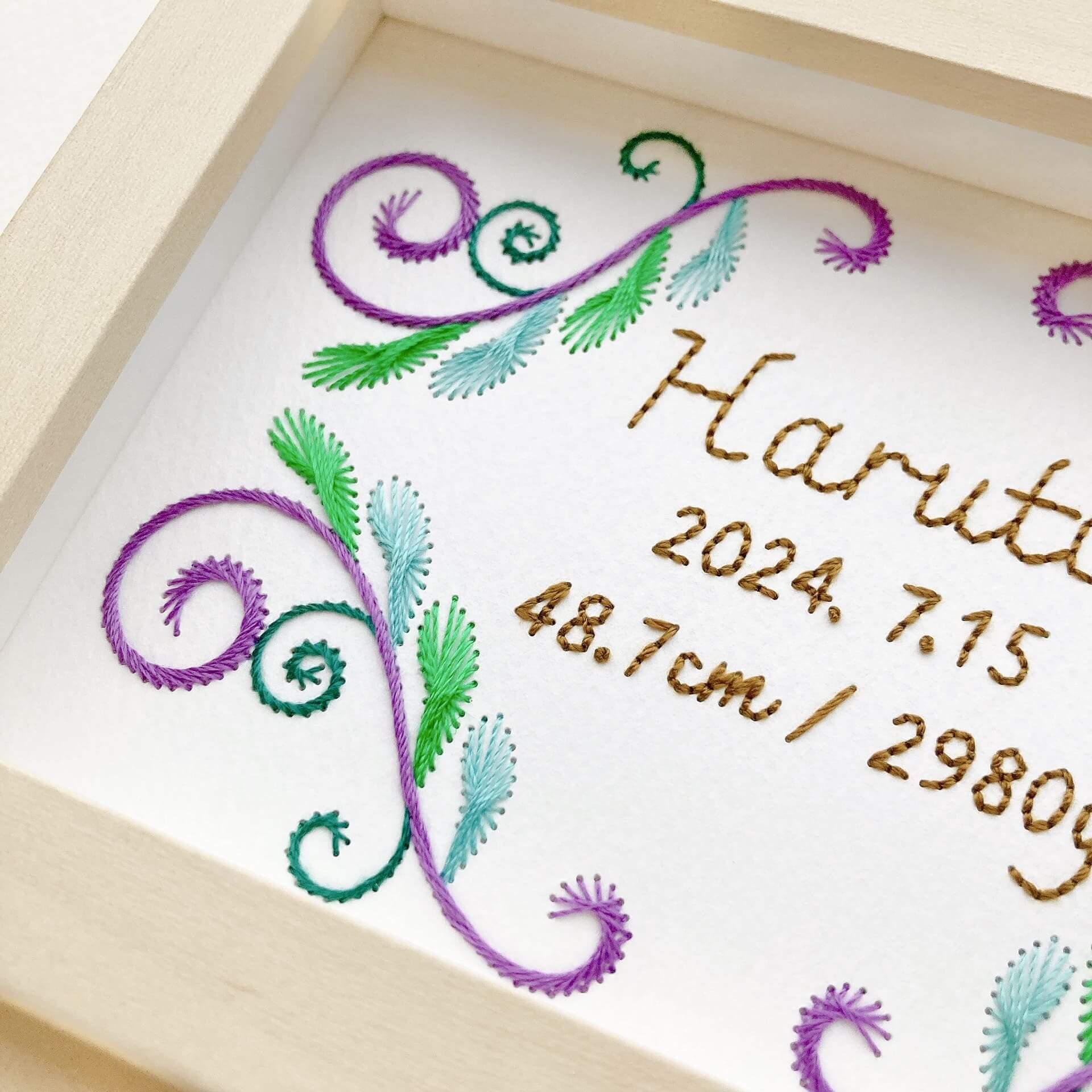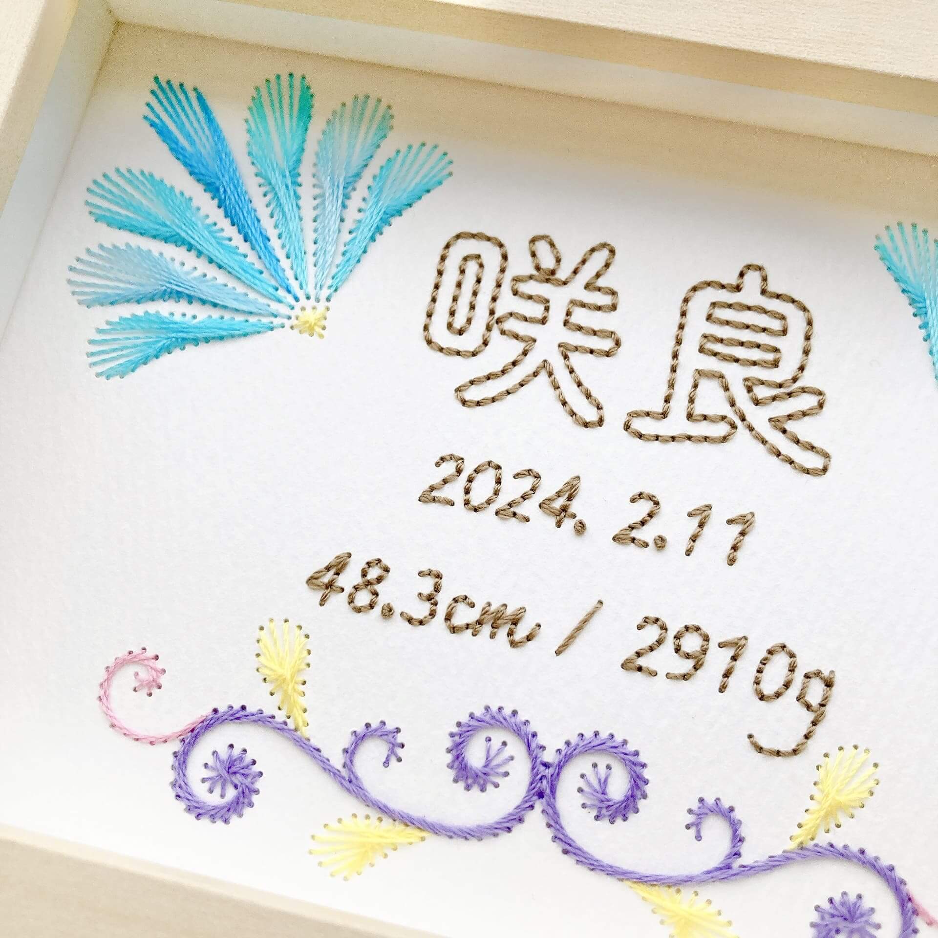 世界に一つだけの贈り物として、末永く愛用できる特別な紙刺繍の命名書を手刺繍でお作りいたします。