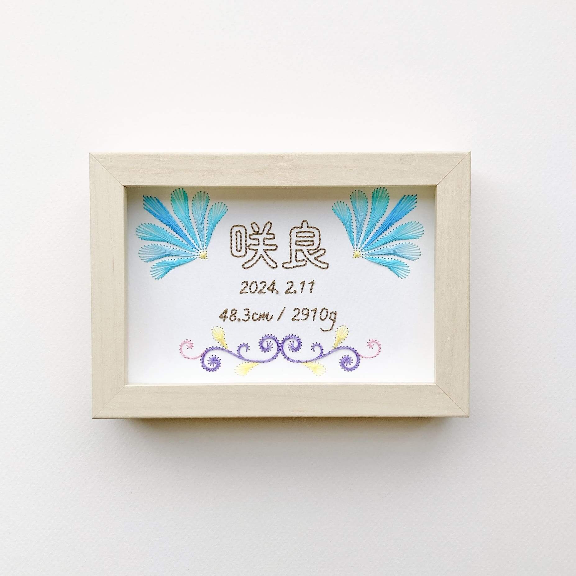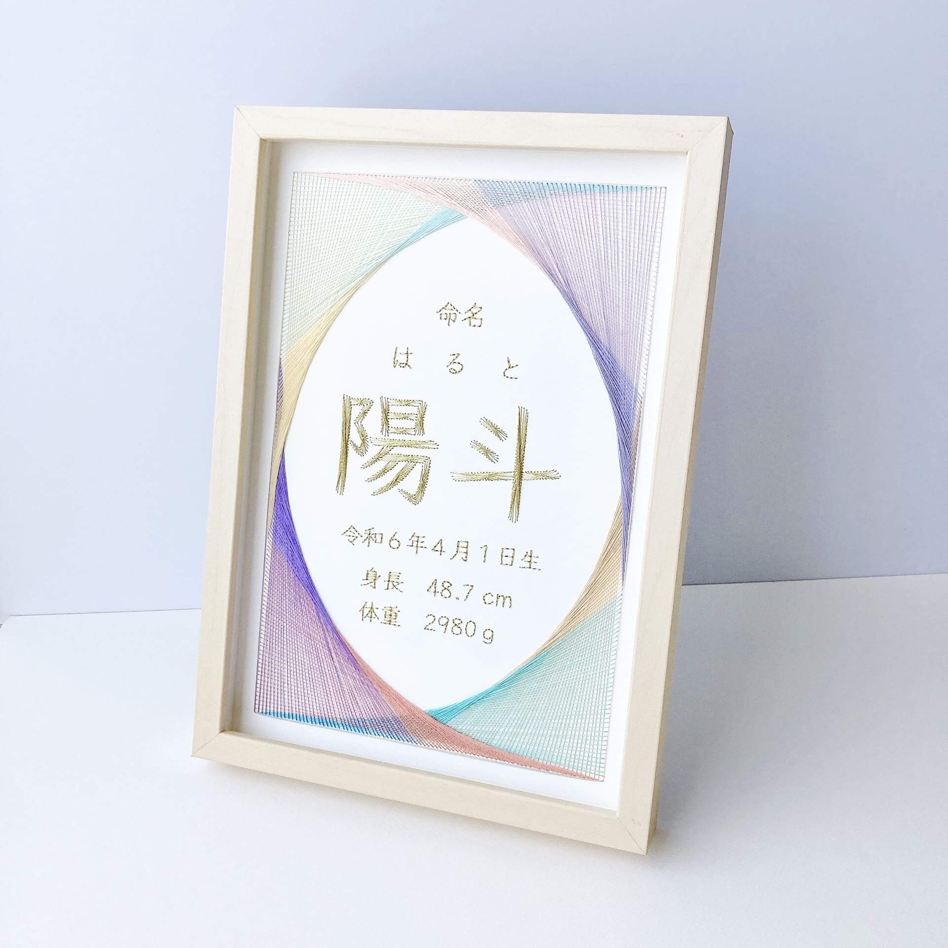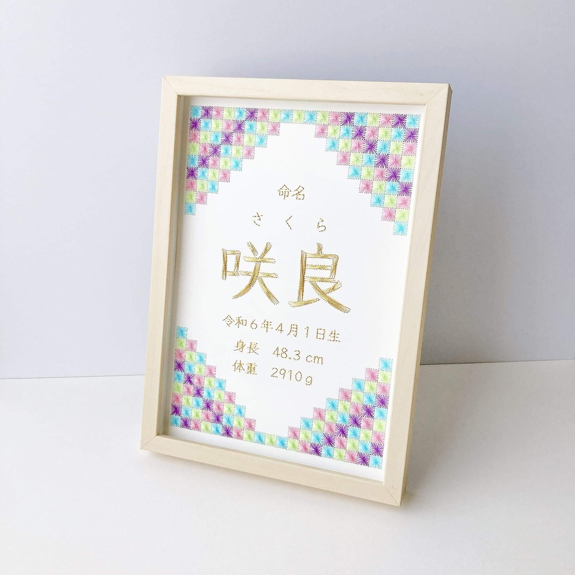 日本の伝統模様「市松模様」をイメージした命名書です。カラフルで元気なイメージの配色で制作しました。名前の刺繍は、糸の流れが美しい「ストリングアート」の技法で制作しています。