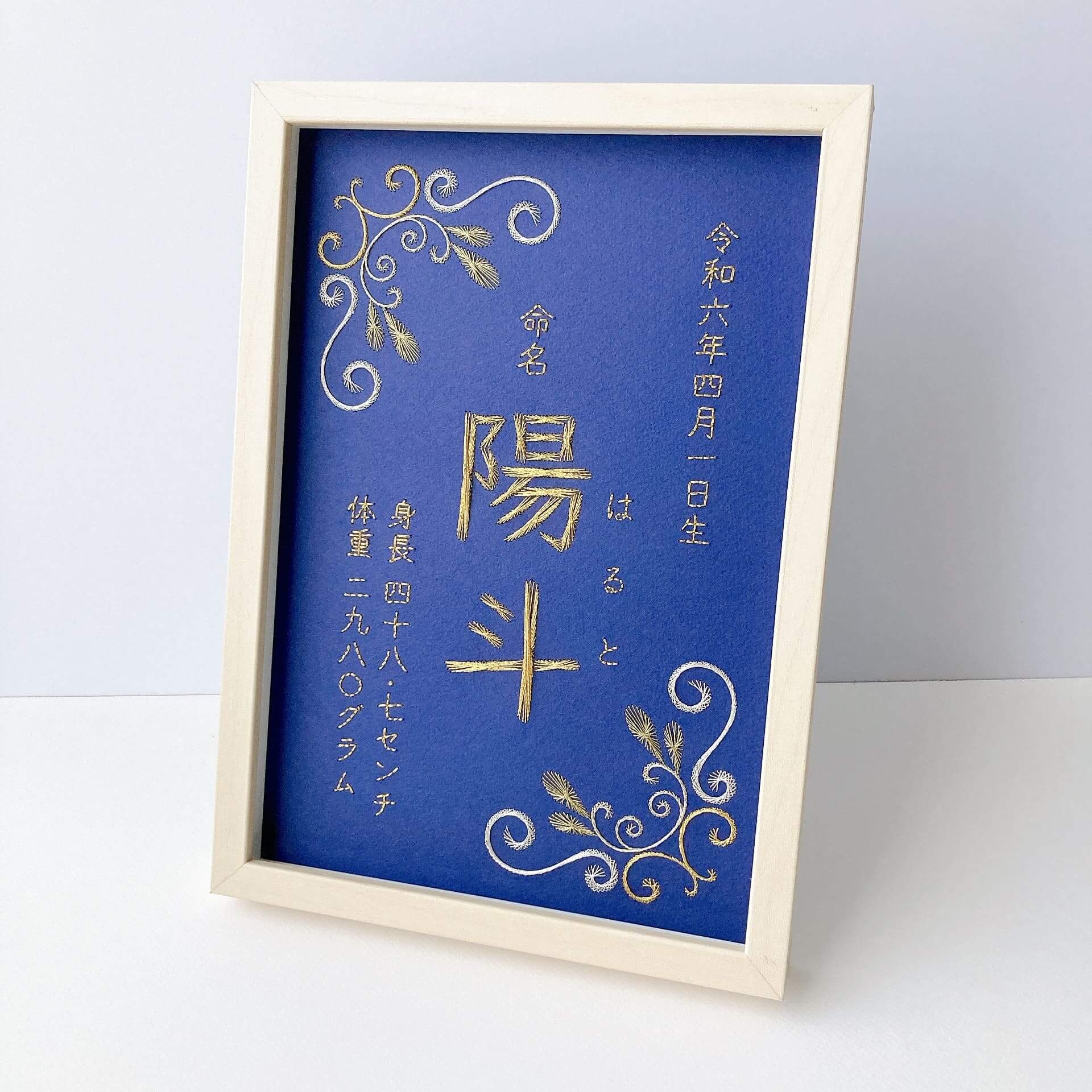 全て金・銀色の糸で刺繍した、とても華やかな命名書です。名前の刺繍は、他のA4の命名書と同じく、糸の流れが美しい「ストリングアート」の技法で制作しています。